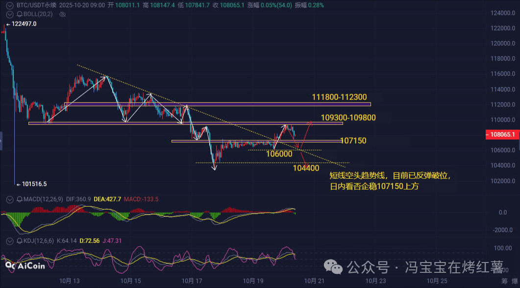 四小时图看,强势拉升后回落至中轨107200支撑附近。日内需关注能否突破10阻力位,下方10为强支撑,只要不破,仍看反弹。