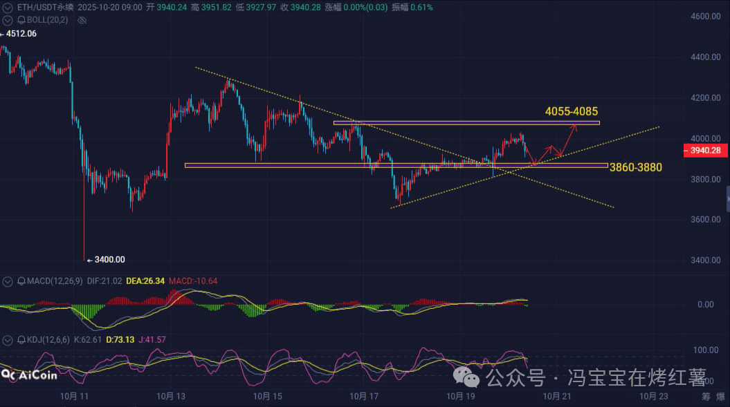 一小时图显示,以太坊价格在3900-4020区间震荡。昨日日线长下影线,表明低位买盘支撑较强,20日收小阳线但未破前高。MACD小时线死叉靠近,柱状图红绿交替,动能减弱,短期偏震荡。
