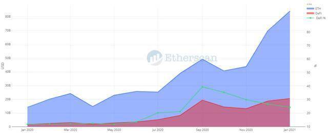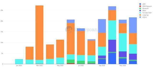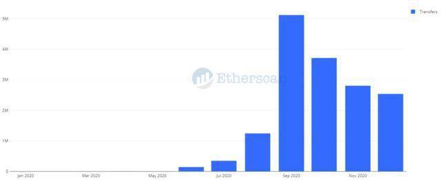 聚焦 2020 年,我们看到几乎每月数据都呈上升趋势。唯一一个例外是在 9 月出现了下降,那时正处于 “流动性挖矿” 热潮期间。