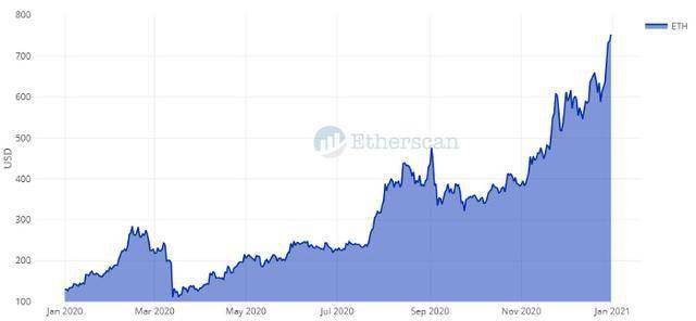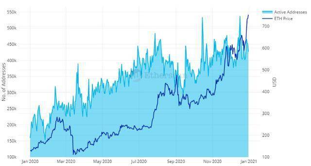 对很多人来说,这是最重要的指标!ETH 的价格在 2020 年迅速回升。截止 2020 年底,ETH 的价格从 129 美元涨至 753 美元,增长了4.8 倍。在撰文期间,以太坊已经在 2021 年屡创新高!这里举一个很流行的衡量基准:2020 年 1 月,成为以太坊 2.0 验证者的成本(32 ETH)为 4128 美元。截止 2020 年 12 月底,该成本高达 24,064 美元。尽管迎来暴涨,ETH 在 2020 年底的价格依然只有其最高历史记录(1448 美元)的 52%。