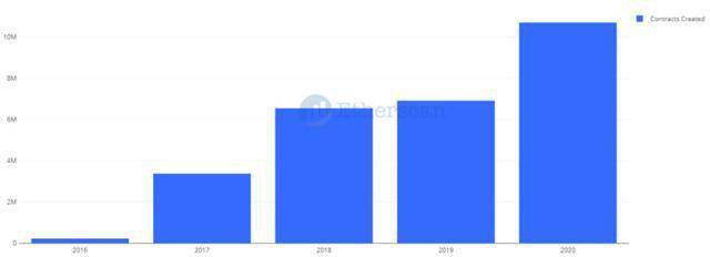 2020 年涌现出大批新创建的合约。其总量从 2019 年的 690 万增至 1070 万,增幅达 55%。