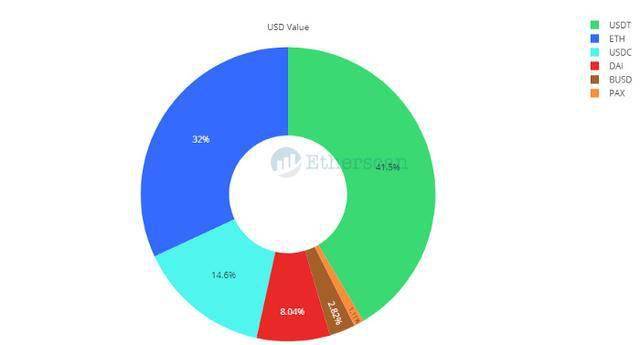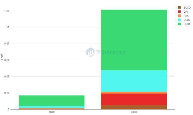 稳定币 上文已经提到,稳定币的转账次数占以太坊上总转账次数的 35%。其交易额甚至更加惊人。仅 USDT 在以太坊区块链上的交易额就超过了 ETH。2020 年,稳定币的总交易额达 1.2 万亿美元以上。