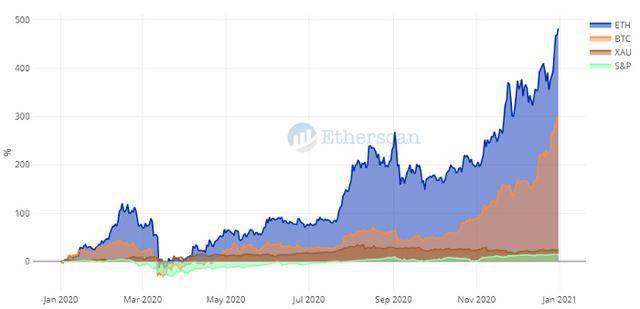 ETH 的表现超过了 BTC、黄金和标准普尔 500 指数等主要资产。截止 2020 年底,ETH 的涨幅为 483%,不仅打败了 BTC(+303%),还令黄金(+24%)和标准普尔 500 指数(+15%)望尘莫及。注:虽然人们普遍认为密码学货币是独立行情资产(non-correlated asset),但是上述四种资产在 3 月份的暴跌呈高度相关性。到 2020 年底,ETH 和 BTC 随着标准普尔 500 指数一起走高,然而黄金(不负独立行情资产之名)仍处于横盘状态。