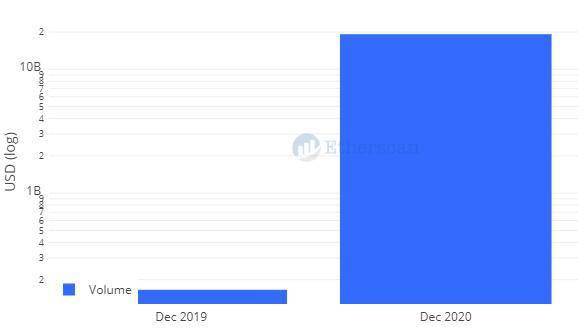 在我们去年发布的 2019 年度回顾和 DEX 文章中,我们强调了整个 DEX 市场的发展并单独分析了 Uniswap 的发展。我们当时也没有料到这二者会在 2020 年取得如此巨大的发展。在 2019 年 12 月,DEX 的总交易额为 1.66 亿美元。截至 2020 年 12 月,其总交易额达到 192 亿美元,增长了 115 倍。