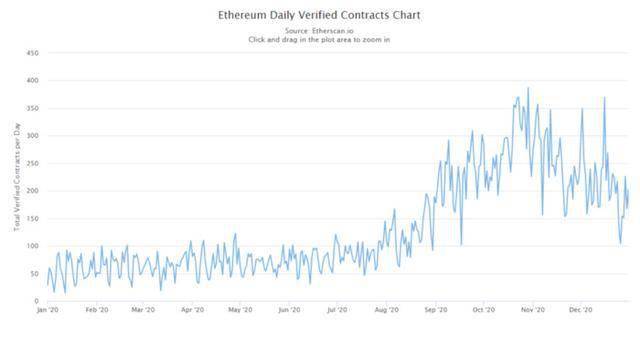 在 2020 年上半年期间,Etherscan 上新验证合约的数量处于稳定水平。在第三季度,随着 DeFi 和流动性挖矿的发展,新合约数量也出现大幅增长,并于 11 月达到顶峰,之后随着年底 ETH 价格(以及 gas 价格)上涨而减少。