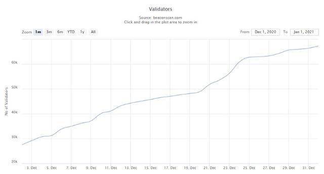 Eth2 信标链启动后,验证者人数在一个月内从 27,500 迅速增至 67,000,是原定最低质押者人数目标(16,284)的 4 倍!
