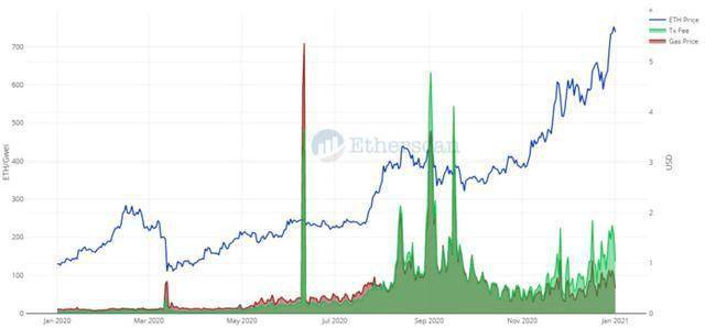 2020 年,由于使用率较高,以太坊持续出现 gas 价格高峰。2020 年 6 月,由于大量用户(包括我自己在内)争先恐后领取 UNI 空投,日均 gas 价格达到 710 Gwei 的高峰。然而,以美元价值来看,9 月的交易费更高,因为 ETH 的价格翻了一番。当时,一笔标准 ETH 转账(21,000 gas 上限)的交易费为 4.8 美元。随着 2020 年底流动性挖矿热潮逐渐退却,gas 价格一直徘徊在 100 Gwei 左右。与此同时,由于 ETH 价格上涨,以太坊的交易费也在攀升。在 2021 年初,随着 ETH 价格飙升,交易费也创下历史新高。
