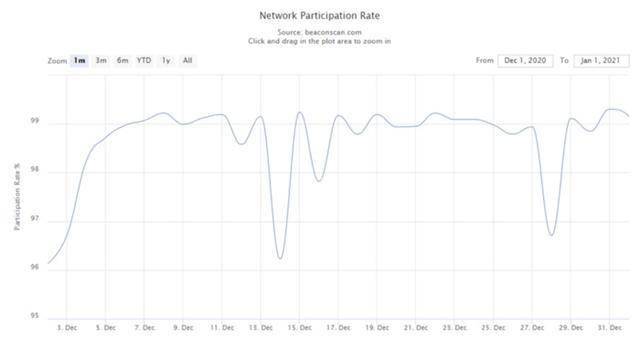 这些验证者中有多少真正参与创建见证消息?Medalla 测试网曾因参与率过低而面临 “无利害关系” 问题。社区成员坚持认为主网上线不会面临同样的问题。目前看来,他们是对的。自信标链启动以来,参与率达到 96% 以上。