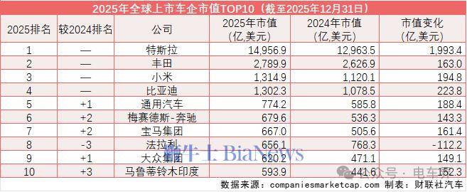 2025年末,特斯拉、丰田、小米、比亚迪蝉联全球市值前四名,四家企业市值均实现同比增长。