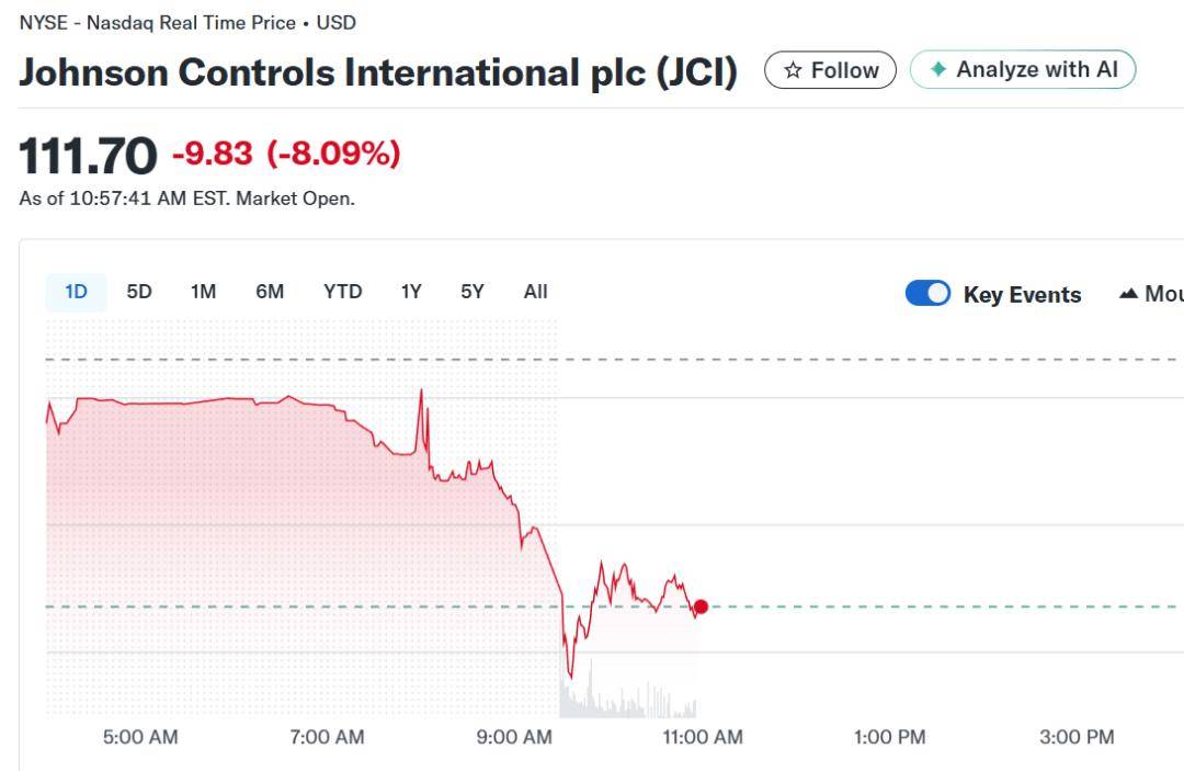 生产水冷机组及类似设备的Johnson Controls股价一度暴跌最多11%,创下自2022年以来最大盘中跌幅。莫迪恩制造暴跌超10%,而开利全球和特灵科技也同步走低。
