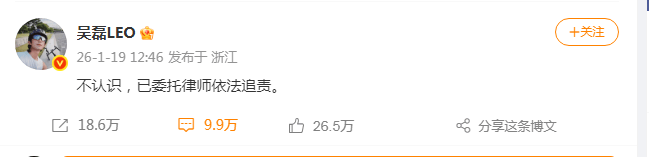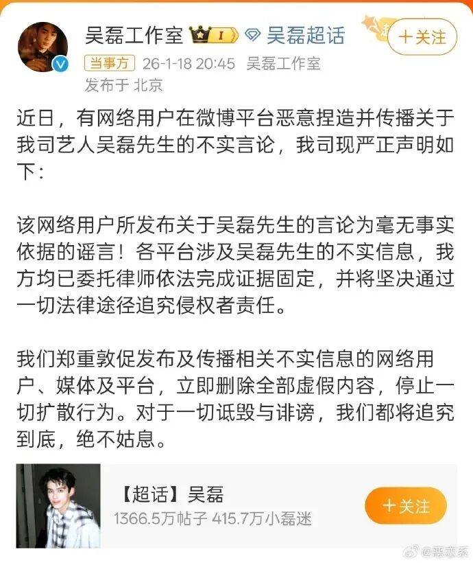 吴磊本人次日回应不认识,已委托律师追责;北京星权律师事务所同日立案,要求微博披露造谣者实名信息,启动诽谤诉讼程序。