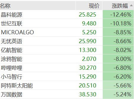中概股多数下跌,晶科能源跌12.5%,世纪互联跌超10%,无忧英语、亿航智能、36氪跌超8%,哔哩哔哩、小马智行、阿特斯太阳能等跌超5%。