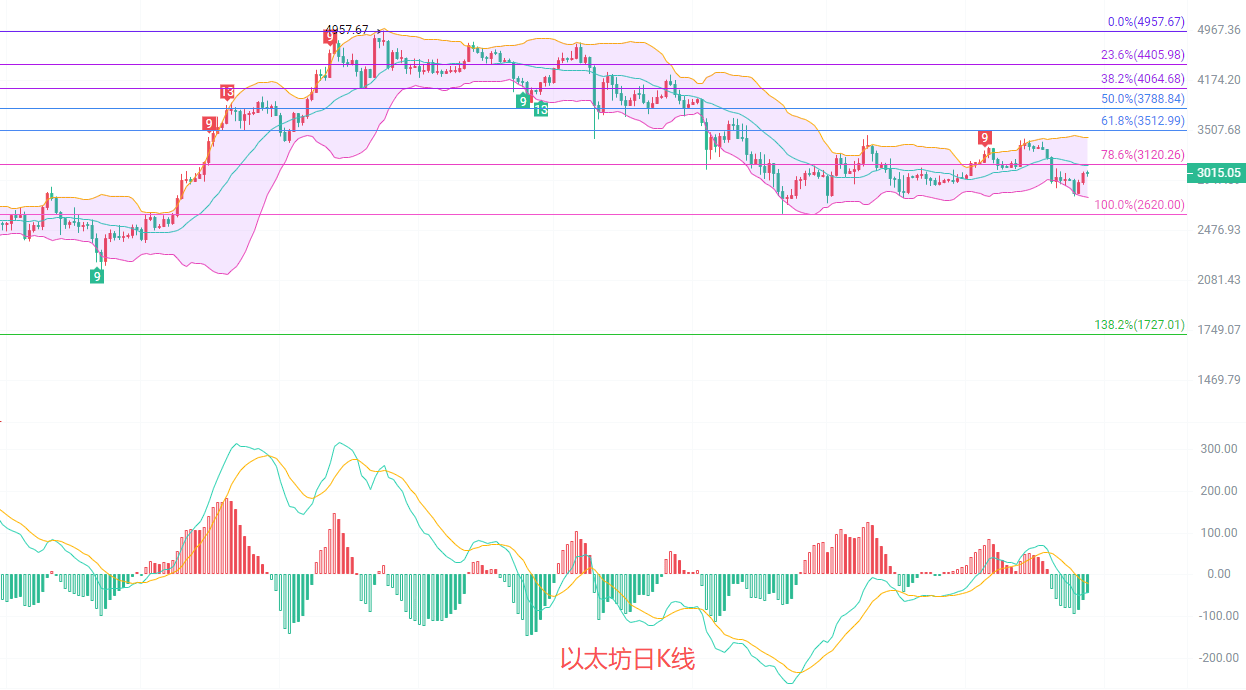 四小时K线持续横盘收缩,MACD连续放量形成顶部背离趋势,DIF和DEA破了0轴线以后就可以收缩,布林带上轨阻力关注3066,短线思路上建议高位南下为主,暂时不考虑北上