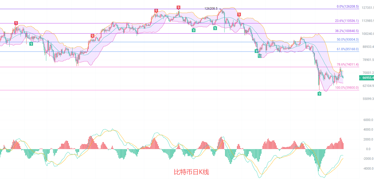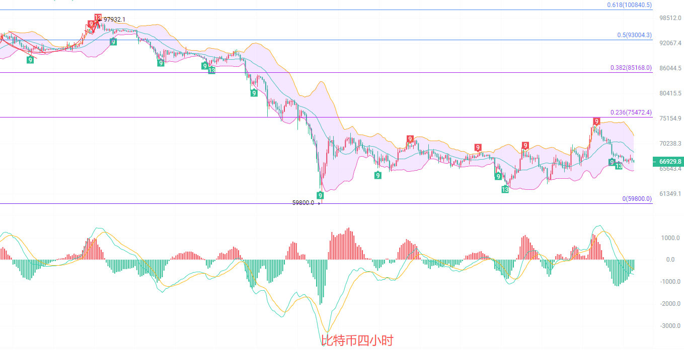 日K线,EMA趋势指标收缩,EAM15短线,中线万关口,MACD连续放量减少梯量降低,DIF和DEA在0轴线下方收缩,布林带中规失守67500,上轨关注71200,下轨参考63800,没有入场的币友可以关注行情跌破64000以后得盘口,已经入场的币友安心持有