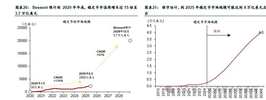 2026-04-19米兰体育,米兰体育官方网站,米兰体育APP下载我们认为稳定币的发展仍大有可为,基准情形下,10年后的市场规模可能达到4万亿美元甚至更高,达到目前规模的16倍以上,隐含年度增长达到32%。稳定币占全球链下结算总额的比例在目前约0.4%的基础上有望提升至3-4%。乐观情形下,稳定币发展速度可能更快,而美国现任政府的预期比我们的基准情形明显更为乐观。美国财政部长贝森特(ScottBessent)近期表示到2029年年底稳定币市值将增长近15倍,达到3.7万亿美元(隐含CAGR约80%)。然而,鉴于随着渗透率的提升,稳定币增长速度或将放缓,保守估计,假设2025年稳定币市值增长80%,之后每3年稳定币市值增速下降一半,10年后稳定币市场规模可能上升超过16倍至4万亿美元以上(图表21)。过去12个月全球稳定币链下交易额约为7万亿美元,约占2024年全球SWIFT结算额的0.4%。随着应用场景的不断拓展,预计未来稳定币在全球支付占比有望明显上升。如果假设稳定币链下交易额按其市值增速增长15倍,而SWIFT结算额按照接近全球名义GDP约5%左右的增速增长,到2035年稳定币占全球SWIFT结算额的比例或将升至3-4%。