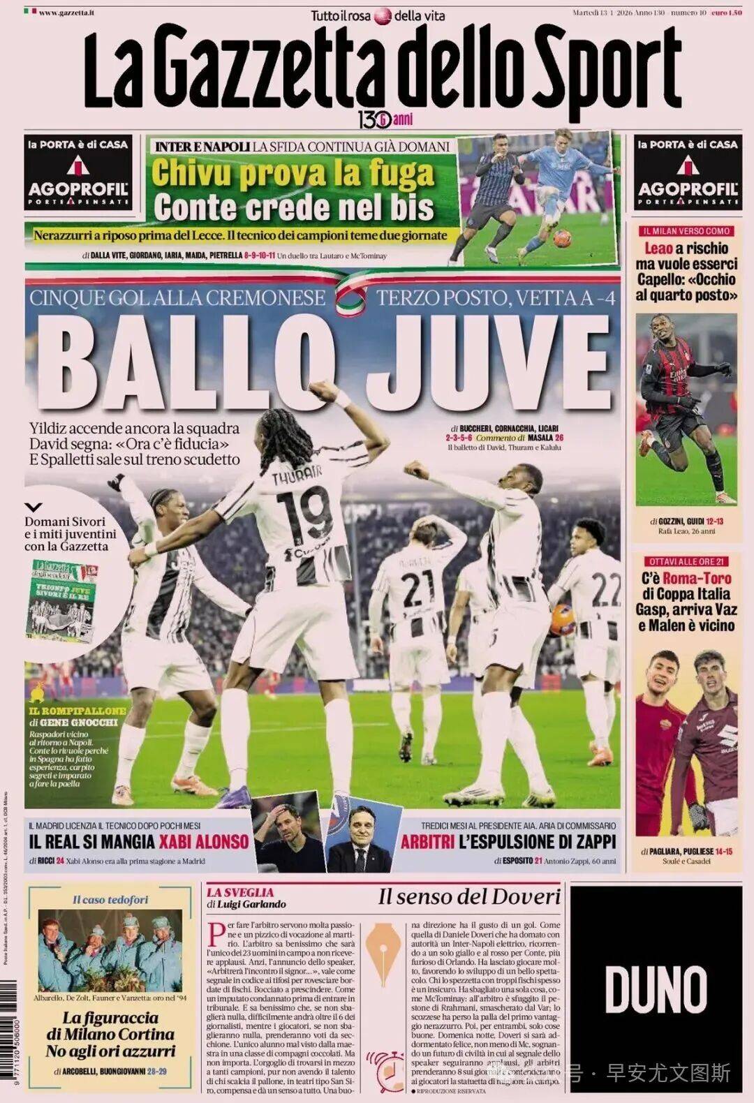 2026-01-15米兰体育,米兰体育官方网站,米兰体育APP下载1、尤文,你怎么能不自信呢?5比0战胜克雷莫内塞,这在国内已经10年没有发生过了。与罗马、那不勒斯并列第三名,距离榜首只差4分,球迷们梦想联赛冠军。在过去的六场比赛中取得了五场胜利:比赛风格和信心。风向似乎改变了:布雷默的幸运进球,大卫再次得分,对红黄军团的点球被撤销(尼古拉被罚下)。伊尔迪兹点球补射得分,特拉乔诺自摆乌龙,麦肯尼完成了大胜。斯帕莱蒂:“我看了国际米兰与那不勒斯的高水准对决,我们仍然需要成长,但如果我们迈出这些步伐,我们可以获得一些东西。”