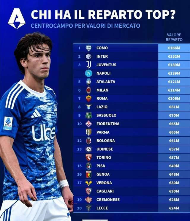德转网站针对意甲各队球员身价进行了统计,包括后卫+门将、中场、前锋等位置的球员归类。防线亿欧元高居榜首,米兰紧随其后,罗马位列第三。在中场球员身价方面,科莫以1.66亿欧元领先,国米排名第二,尤文与那不勒斯并列第三。而在前锋身价统计中,尤文以2.31亿欧元居于第一,国米排名第二,米兰排在第三。